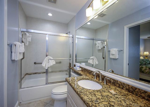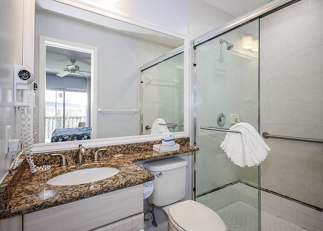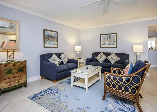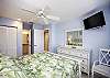 Both bedrooms feature king beds with premium Sealy firm mattresses, and the living room includes a queen-size sleeper sofa with an upgraded mattress. Updated bathrooms offer comfort-height toilets and safety grab rails in the showers. The primary bedroom opens to a rear lanai with lovely garden and pool views, while the spacious front lanai, a corner-unit bonus, is newly furnished and perfect for outdoor dining.